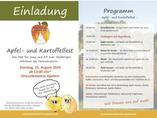 Am 25.8. lädt der Heimatverein Apelern zum Apel- und Kartoffelfest ein! Wir sagen schon vorab herzlichen Glückwunsch zum 50jährigen Jubiläum an den Heimatverein! Wenn Sie dabei sein wollen, finden Sie Informationen auf dem angehängten Flyer oder hier online: https://www.heimatverein-apelern.de/…/apfel-und…/ Viel Spaß am nächsten Sonntag ! #zusammengehtmehr #iga #zusammenhalt #igapelern #apelern #einladung #termine #vereinsleben #gemeinschaft #ehrenamt…