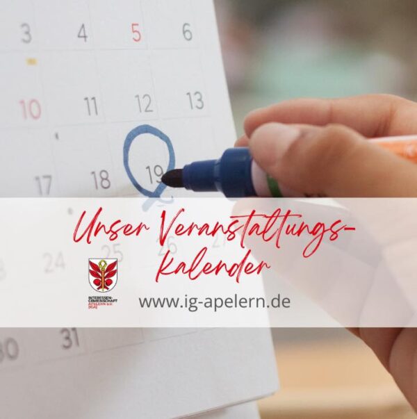 Wir verbinden mit unserer Interessengemeinschaft viele Vereine und Organisationen aus Apelern. Unser zentraler Veranstaltungs-Kalender ist daher ein zentrales Instrument. Hier können sich alle anschauen, welche kommenden Events es in der Gemeinde gibt. Ihr plant eine Veranstaltung mit eurem Verein? Dann lasst es uns wissen! Vereinsmitglieder können uns ihre Veranstaltung bequem über unsere neue Website mitteilen…
